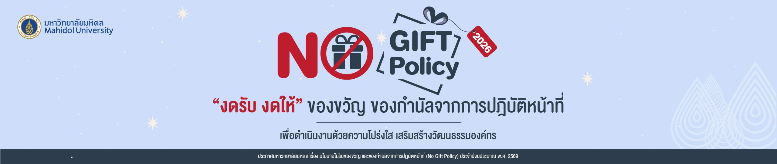 - มหาวิทยาลัยมหิดล ประกาศนโยบายไม่รับของขวัญ และของกำนัลจากการปฏิบัติหน้าที่ (No Gift Policy) พ.ศ. 2565